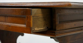 Tavolo scrittoio in noce costruito con elementi antichi, piano rettangolare con un cassetto sottostante, montanti laterali ad asso di coppe riuniti da trasversa, cm h 63.5x79x51.5, (difetti)