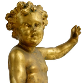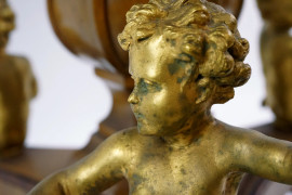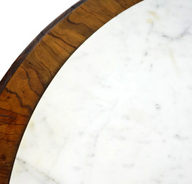 Tavolo tondo in legno impiallacciato, metà XX secolo, piano con marmo di Carrara incassato, fusto a balaustro poggiante su base quadrilobata abbellita da quattro puttini dorati, cm h 66x70, (difetti)