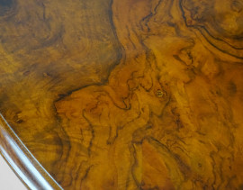 Tavolo tondo in radica di noce, XIX secolo, piano circolare sostenuto da montante scolpito poggiante su base circolare e tre piedi leonini, cm h 75, diametro del piano cm 123, (difetti)