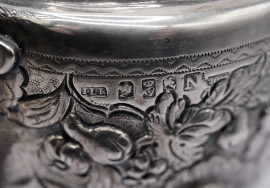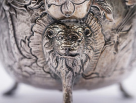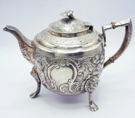 Teiera in argento, Dublino, argentiere James Le Bas, XIX secolo, decori incisi e sbalzati, poggiante su quattro piedini zoomorfi, cm h 14x17, peso gr. 415