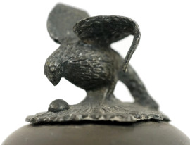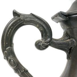 Teiera in peltro, particolari incisi e coperchio con presa lavorata foggia di aquila, cm h 25, XX secolo.