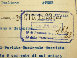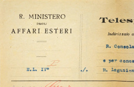 Telespresso del Ministero degli Affari Esteri, Documento di rilevanza storica a firma Mussolini riguardante la colonia di Salonicco, cm 29x21.