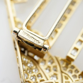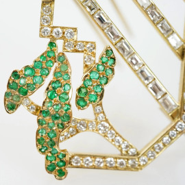 Tiffany & Co, spilla in oro giallo 18 kt con brillanti e smeraldi, cm 3.5x5.8, peso gr. 19, (difetto)