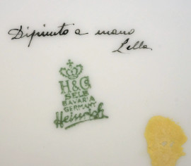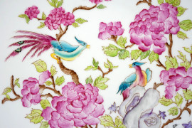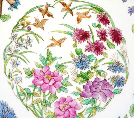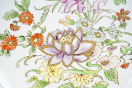Tre grandi piatti in porcellana dipinta a mano, decorazioni policrome in stile orienatale, XX secolo, diametro max cm 32