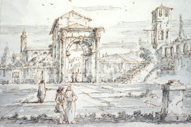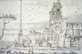 Trinità dei Monti e Piazza con figure, coppia di disegni realizzati ad inchiostro bruno ed acquarello su carta, cm 17x22,5, XIX secolo, entro cornici, (macchie)
