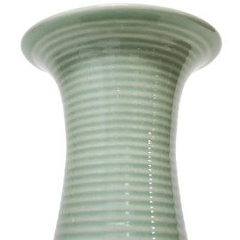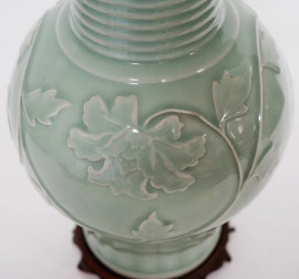 Vaso cinese in porcellana color celadon, corpo a balaustro con decori floreali a rilievo, base in legno, cm h 43, (lievi difetti)