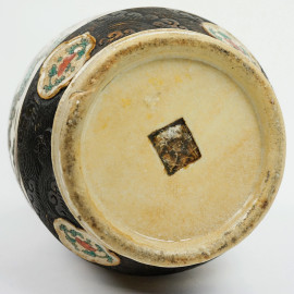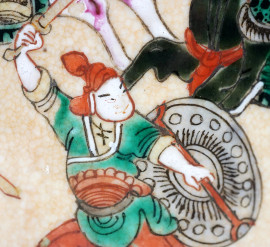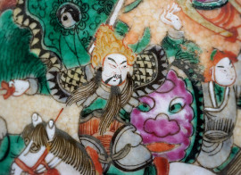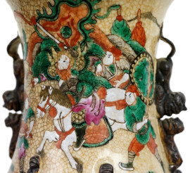 Vaso in porcellana a smalti policromi, arte orientale, inizi XX secolo, decorato a tutto corpo da una rappresentazione di nobili e Samurai, anse zoomorfe, cm h 45, (difetti)