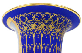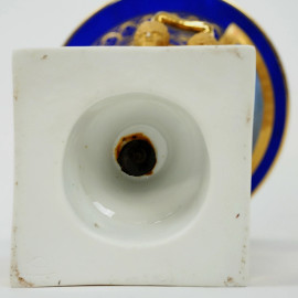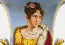 Vaso in porcellana policroma, Francia, XIX secolo, ampio orlo svasato, corpo a fondo blu cobalto, fronte con riserva dipinta in policromia raffigurante ritratto di nobildonna, doppia presa laterale a mascheroni, cm h 28x21, (lievi difetti)