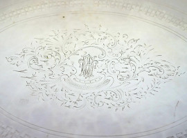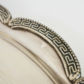 Vassoio di linea sagomata in metallo argentato, doppia presa laterale e profilo a meandro, cm 61,5x39, XX secolo.