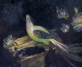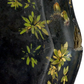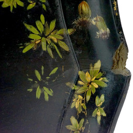 Vassoio in papier-maché laccato nero con decori floreali policromi, fine secolo XIX, cm 79x59, (difetti)