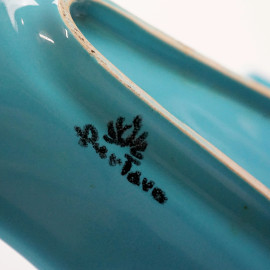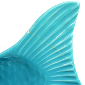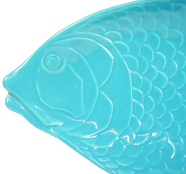 Vassoio pescera in ceramica smaltata celeste, XX secolo, cm 68x32, (difetti)