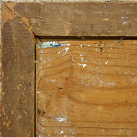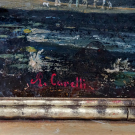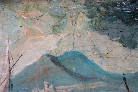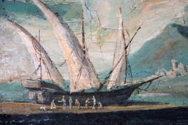 Veduta costiera con imbarcazioni, olio su tavola, cm 15,5x30,5, firmato, entro cornice.