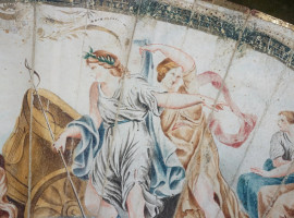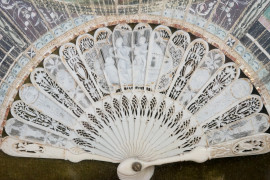 Ventaglio in carta dipinta, Francia, XVIII-XIX secolo, riserva raffigurante scena mitologica, stecche finemente lavorate a traforo, entro teca, misure ingombro tot. cm 35,5x59x5, (difetti)
