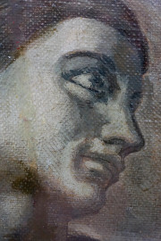 Volto, tecnica mista su tela riportata su cartone, cm 18x15, firmato, entro cornice