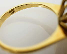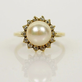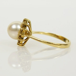 Anello in oro giallo 18 kt con perla e diamanti, misure n. 14, peso gr. 4,5
