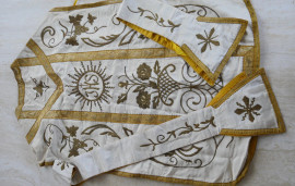 Antico paramento sacro ricamato in oro , multiple coroncine da rosario di varia fattura, bottiglia in ceramica dipinta a mano in oro , cm 28 x 19