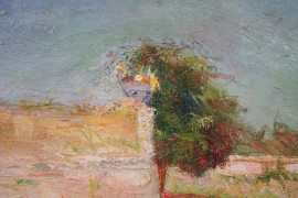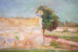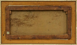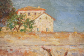 Casolare di campagna, olio su tela, cm 34,5x70, XX secolo, entro cornice.