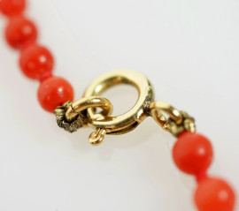 Collana in corallo con chiusura in oro giallo 18 kt, lunghezza cm 53, peso gr 8