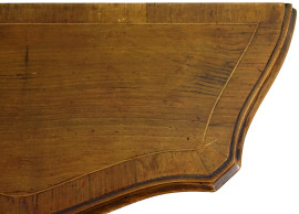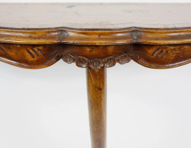 Console in noce, XX secolo, piano di linea sagomata sostenuto da un unico montante mosso, particolari intagliati, ingombro cm 85x75,5x30, (difetti)