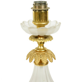 Coppia di lampade da tavolo in vetro satinato, con montature in metallo dorato, XX secolo, cm h 53