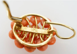 Coppia di orecchini di corallo e oro 18 kt, cm 2,5, peso gr. 7,8