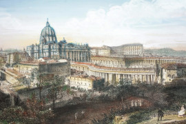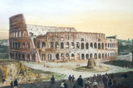 Coppia di stampe a colori raffiguranti il Colosseo e Piazza San Pietro, cm 25x30, XX secolo, entro cornici.
