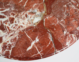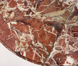 Coppia di tavolini tondi, XX secolo, piani circolari in marmo rosso, montante centrale a colonna scanalata poggiante su base con anima in legno rivestita in metallo, cm h 61x55, (difetti, restauri)