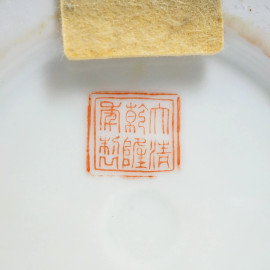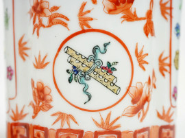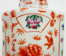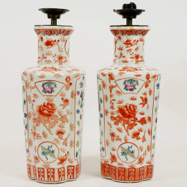 Coppia di vasi montati a lampade in porcellana policroma nei toni dell'arancio, cm h 47, arte orientale, XX secolo, (difetti)
