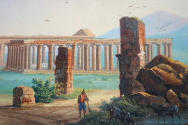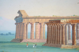Il Tempio di Paestum, acquarello su carta, cm 55x73, XX secolo, entro cornice.