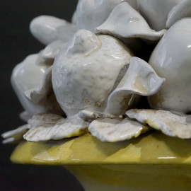 Lampada in maiolica smaltata a forma di cesta di frutta, inizi XX secolo, cm 49x39, (difetti e restauri)