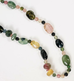 Lotto di tre collane realizzate con pietre pregiate multicolore, chiusure in oro giallo 18 kt e argento, lunghezza max cm 54