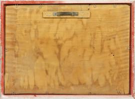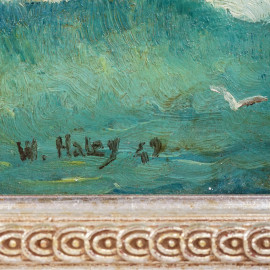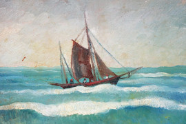 Marina con imbarcazione, olio su tavola, cm 20,5x28,5, firmato e datato, entro cornice