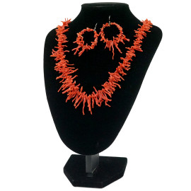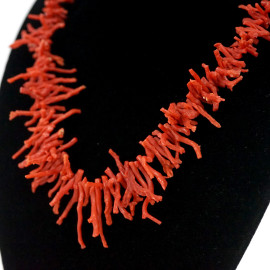 Parure composta da collana e coppia di orecchini in corallo con chiusura e ganci in argento, oreficeria italiana, XX secolo, lunghezza collana cm 73, diametro orecchini cm 4, (imperfezioni)
