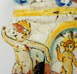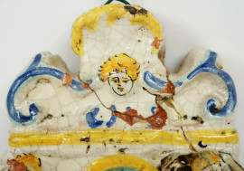 Piccola acquasantiera in maiolica smaltata policroma con decoro di putti, XIX secolo, cm h 20x11, (difetti e restauri)