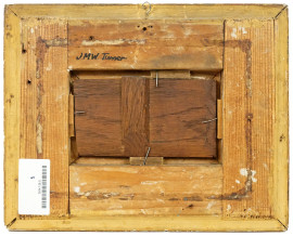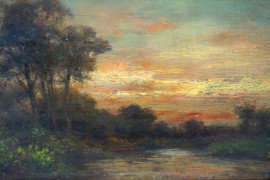 Pittore del XIX secolo, Paesaggio fluviale al tramonto, olio su tavola, cm 8 x 14, entro cornice
