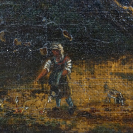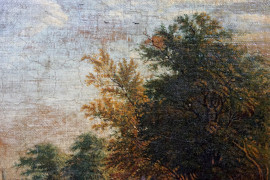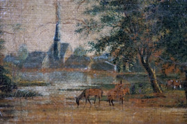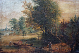 Pittore del XIX secolo, Paesaggio fluviale, olio su tela, cm 32,5 x 38,5, entro cornice