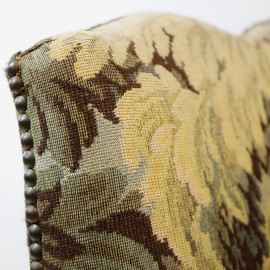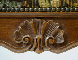 Poltroncina in noce, inizi XX secolo, rivestita in tappezzeria floreale, struttura con particolari intagliati, quattro gambe mosse desinenti a piedi caprini, cm h 96, (segni del tempo)