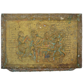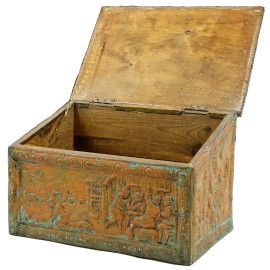 Portacarbone in legno rivestito in metallo dorato, decori a rilievo raffiguranti scene di genere, XX secolo, cm 29x45x28, (difetti)