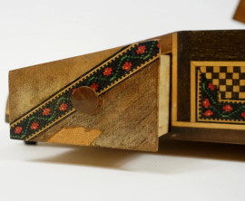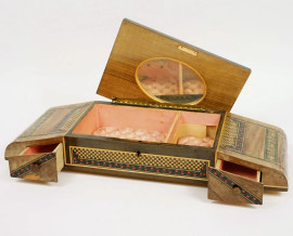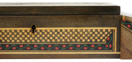 Portagioie sorrentino, finemente intarsiato in legni pregiati, decorazione a micromosaici geometrici e floreali, interno capitonnè, XX secolo, ingombro cm 6x39x14, (difetti, parti rotte)