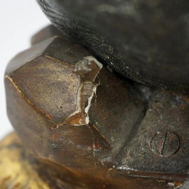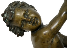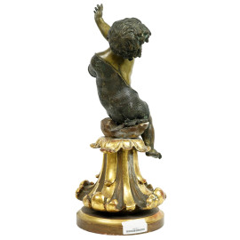 Putto in metallo dorato, base in legno dorato e scolpito, XX secolo, cm h 55, (difetti)