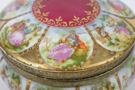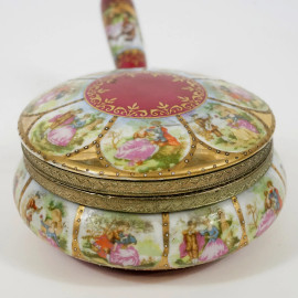 Scaldaletto in porcellana policroma con riserve raffiguranti personaggi e scene di corteggiamento, Germania, metà XX secolo, marchio sotto la base, cm h 8x25x18, (difetti)