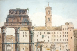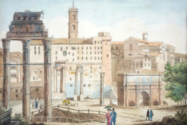 Scorcio dei Fori Imperiali, acquerello su carta, cm 32x37, inizi XX secolo, entro cornice.