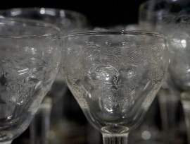 Servizio di bicchieri in vetro molato, XX secolo, composto da: 12 bicchieri da acqua, 7 calici da vino, 9 coppe da champagne, 11 bicchierini da liquore, 12 bicchierini da amaro, (servizio incompleto, difetti)