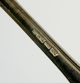 Composto da : 9 posate da portata, 12 cucchiai grandi, 12 forchette grandi, 12 coltelli grandi, 11 forchettine, 12 cucchiai medi, 12 coltelli medi, 12 forchettine e 12 coltelli da pesce, 12 forchettine, 12 cucchiaini da dolce, 19 cucchiaini da caffè, 12 cucchiaini da dolce, (servizio non completo e alcuni cucchiaini non pertinenti).