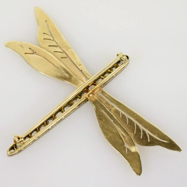 Spilla a forma di libellula in oro 18 kt e argento, impreziosita da diamanti, cm 5,5x7,5, peso gr. 9,4, (mancante un diamante)