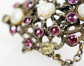 Spilla di bigiotteria vintage impreziosita da perla, madreperla e vetri colorati, cm 4,5, (imperfezioni)
