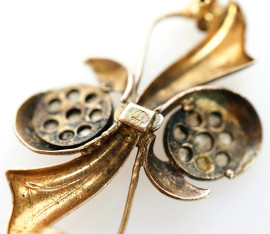 Spilla in oro basso a forma di fiocco impreziosita da brillantini e rubini, cm peso gr. 6,3