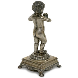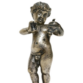 Statuina raffigurante un putto con un grappolo d'uva su piedistallo quadrangolare con piedi zoomorfi in argento, manifattura italiana, XX secolo, h cm 14,5, peso gr. 312