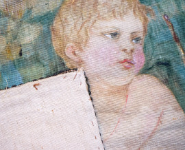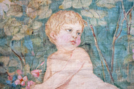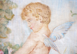 Succo d'erba raffigurante puttini alati con rose, cm 67x121,5, XX secolo, (difetti)