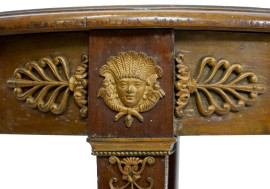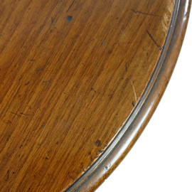 Tavolino in noce, XX secolo, con piano circolare sostenuto da quattro montanti ad obelisco rovesciato riuniti da crociata poggiante su quattro piedi ferini, applicazioni e finiture in metallo dorato, cm h 75x50, (difetti)
